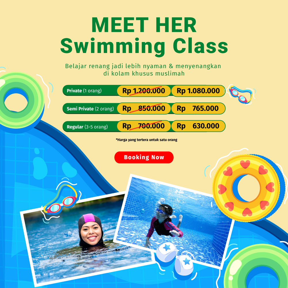 Kolam renang khusus muslimah dengan suasana privat dan nyaman—tempat sempurna untuk berenang bersama sahabat, anak perempuan, atau ibu tercinta. Dirancang eksklusif bagi perempuan, Meet Her Swimming Pool menghadirkan pengalaman olahraga sekaligus relaksasi yang menenangkan, menjaga vitalitas fisik sekaligus memberi ruang untuk quality time yang aman dan menyenangkan.
